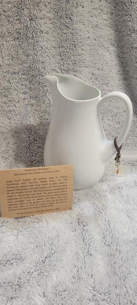 Enjoy fresh flowers all summer long by visiting Farmhouse Hill’s You-Pick Flower Farm, owned by Brad and Stacie Hudson. Use this farmhouse pitcher with floral charm as your ticket to explore the gardens and pick blooms one time per week for the duration of our 2025 summer floral season, anticipated to begin in July.