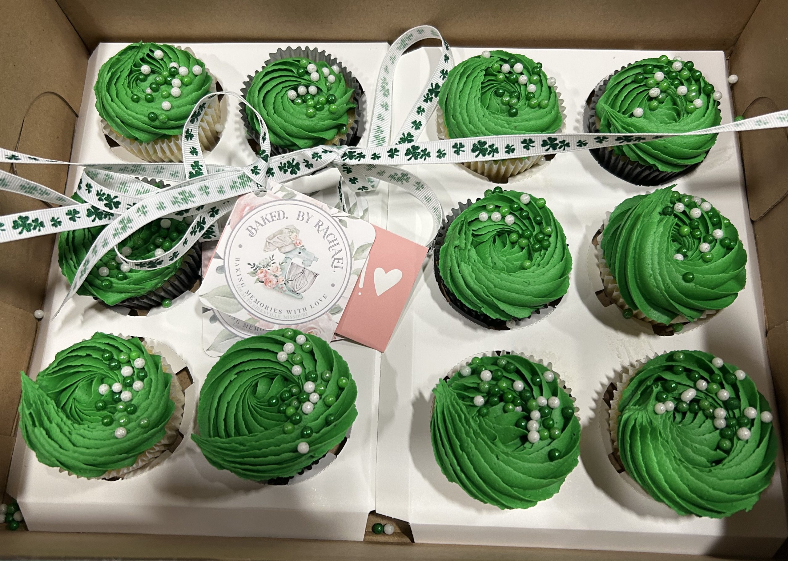 Celebrate St. Patrick’s Day with a dozen delicious, festive cupcakes from Baked. by Rachael! These perfectly baked vanilla cupcakes are topped with smooth, creamy buttercream frosting and decorated with a fun St. Patrick’s Day theme. Whether you’re indulging in them yourself or sharing with friends, these treats are sure to bring a little luck and sweetness to your celebration. Each cupcake is made with love and high-quality ingredients by Rachael McFarland, the talented baker behind Baked. by Rachael, a home-based bakery known for its delicious creations in Kirksville.